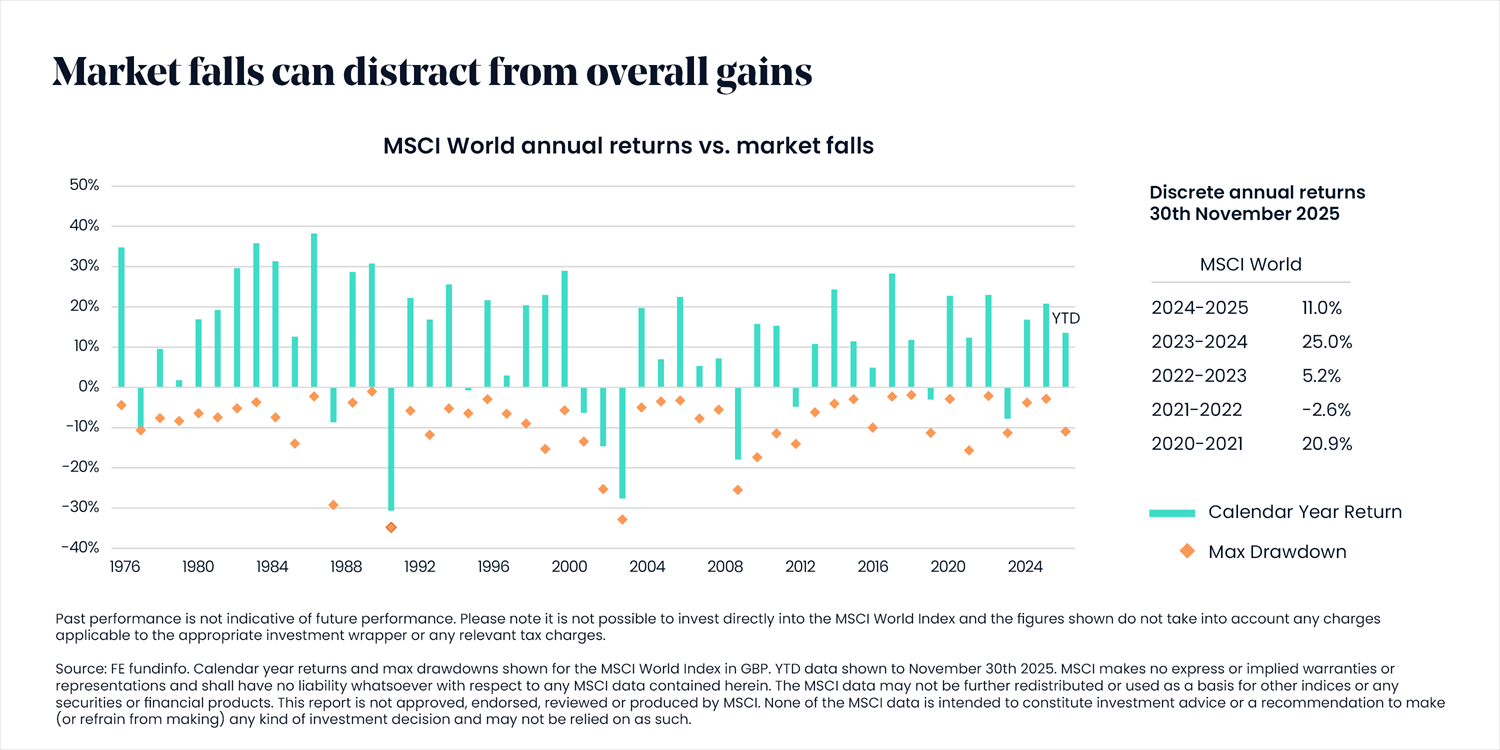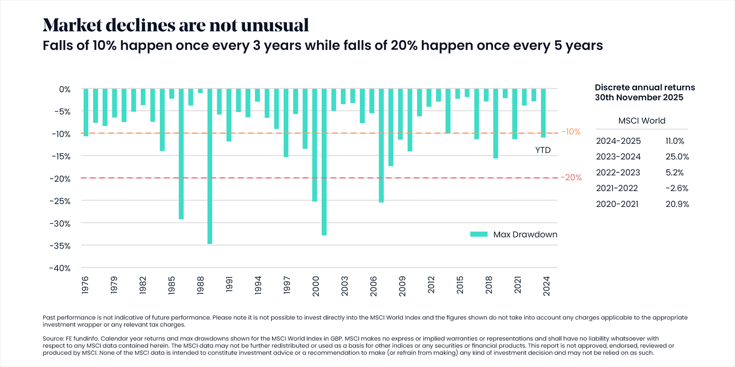 In fact, the chance of markets falling by at least 5% a year is more common than not, based on MSCI World data. The chart below shows that between 1976 – 2025 the chance of an annual market decline – or drawdown – of at least 5% stood at nearly 70%.